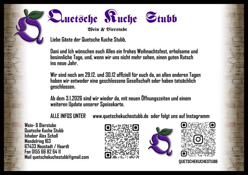 An folgenden Tagen sind wir NICHT für euch da oder haben eine geschlossene Gesellschaft 24.12.25 / 25.12.25 / 26.12.25 / 27.12.25 / 28.12.25