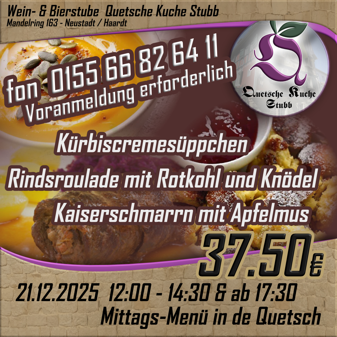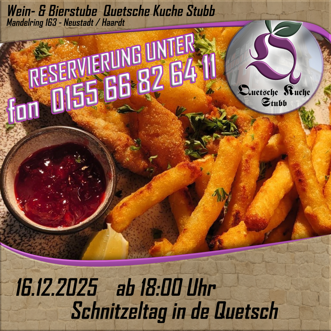 am 16.12.2025 ab 18:00 Uhr gibt es in der Quetsche Kuche Stubb Kalbsschnitzel – in verschiedenen Varianten.Kommt vorbei und genießt lecker Schnitzel vom Kalb, frisch geschnitten, plattiert, paniert und in der Pfanne ausgebacken, so wies gehört.Am 16.12.2025 werden wir noch ein paar Varianten zum Wiener Schnitzel anbieten: